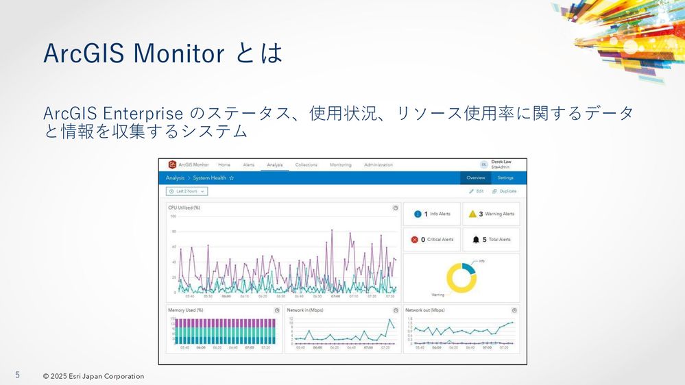 最初に紹介するのは ArcGIS Monitor についてのセッションです。ArcGIS Monitor とは、ArcGIS Enterpriseのパフォーマンス、状態、システムの使用状況を監視して、GIS運用 の最適化を目的としたシステムです。