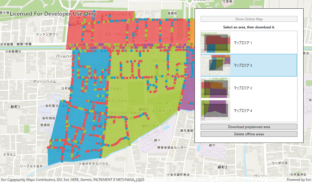 以下は、Esri が公開しているサンプルソース (Download preplanned map area) を使用して実行したアプリの例になります。