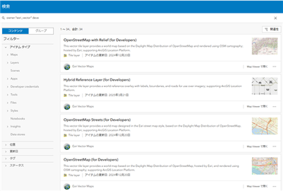 3. 名前に「(for Developers)」が付いているアイテムの中から、World Street Map (道路地図) や World Topographic Map (地形図) 等の任意のアイテムを選びます。選択したアイテムの名前部分をクリックして、左下に表示される [詳細の表示] をクリックします。