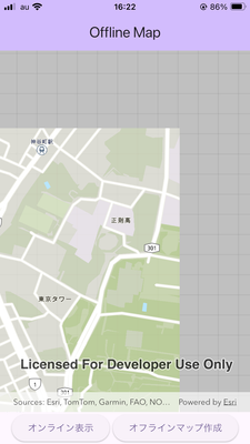 16. 以上でダウンロード機能の実装は完了です。ビルドして任意の場所をダウンロードしてみてください (現在のマップの表示範囲のデータがダウンロードされます) 。ダウンロードが完了すると、その範囲のデータしか表示されていないことが分かります。