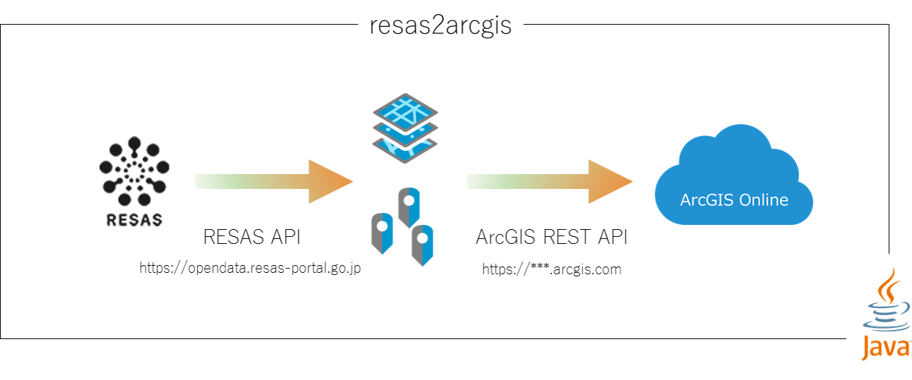 この resas2arcgis という Web サービスをざっくり説明すると、「RESAS API データを取得するための URL と ArcGIS で作成したデータ、その他必要情報を設定すると、ArcGIS へ RESAS API のデータが入力できる!」というものです。