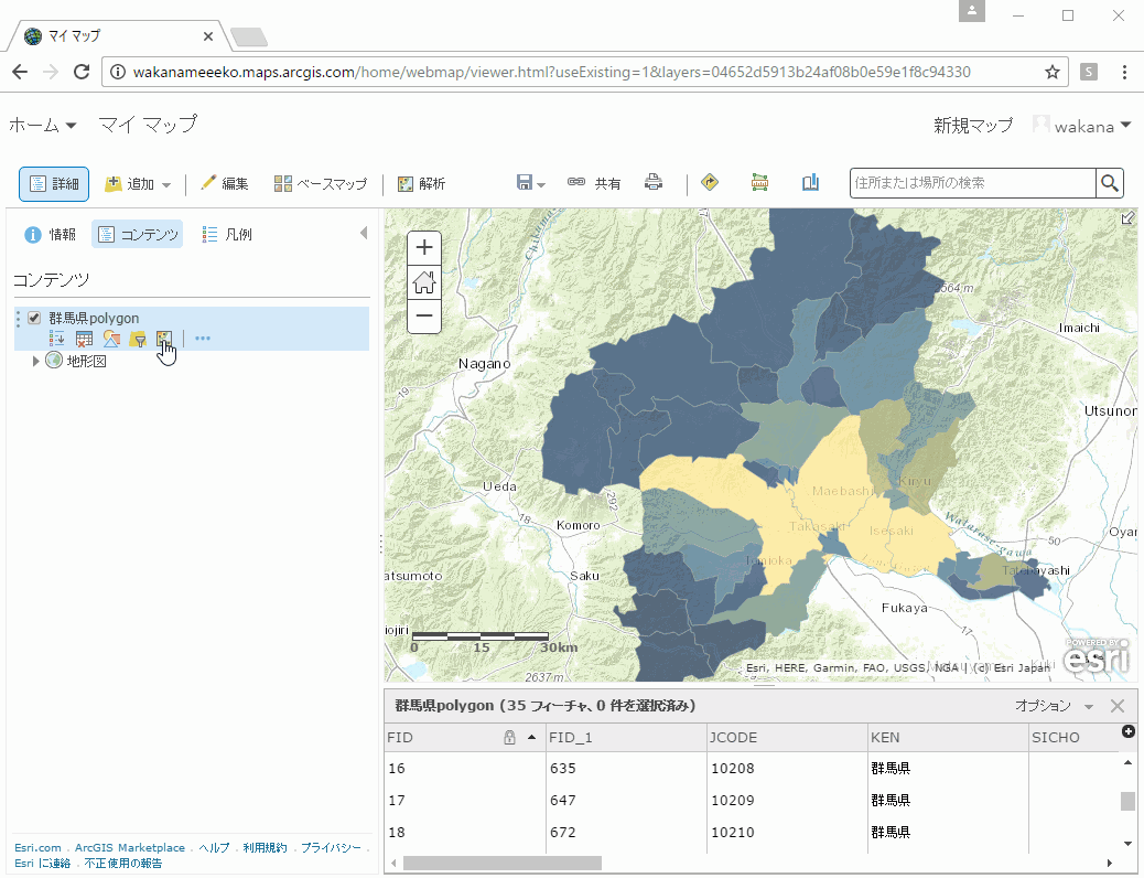 ArcGIS Open Data にあるデータを使って地図データの基礎を作ります。このデータは既に人口の値(P_NUM)※を持っているため、resas2arcgis を使って入力した将来人口推計のデータと比較します。