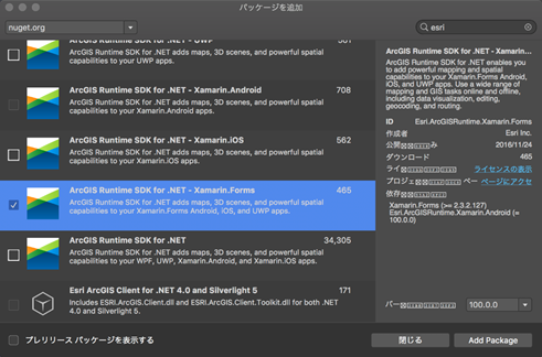 ArcGIS Runtime SDK for .NET は、NuGet パッケージからインストールすることができます。「パッケージの追加」から「ArcGISRuntime SDK for .NET - Xamarin.Forms」を選択してパッケージをインストールします。