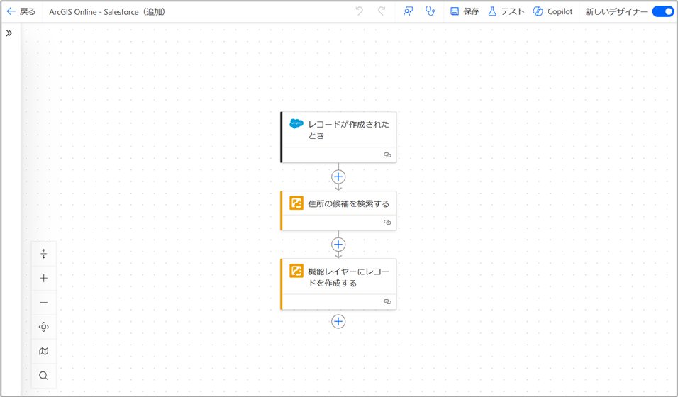 Salesforceの「レコードが作成されたとき」コネクターを使用します。ArcGIS では、追加したレコードの住所からジオコーディングを行い、緯度経度を取得するため、「住所の候補を検索する」コネクターを使用します。最後にフィーチャ レイヤーにデータを追加するため、「機能レイヤーにレコードを作成する」コネクターを使用して、クラウド フローを作成します。