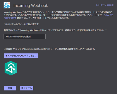 Incoming Webhook の設定画面では、Webhook の名前を入力し、[作成] をクリックします ( 必要に応じてアイコン画像も設定します ) 。