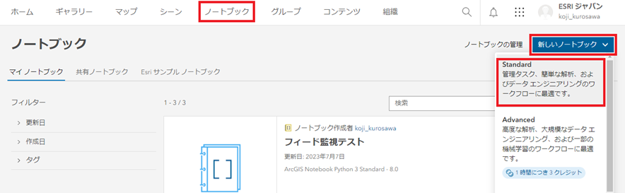 ArcGIS Online の組織のバナー上部にある [ノートブック] タブから [新しいノートブック] → [Standard] を選択し、新しいノートブックを作成します (この時点で使用しているノートブックのランタイムは「ArcGIS Notebook Python 3 Standard – 8.0」となります )。