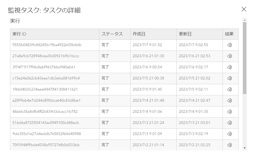 保存したノートブックの詳細画面にある [タスク] → […] → [詳細の表示] からタスクの実行状況や結果を確認することができます。