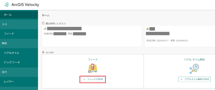 ArcGIS Velocity へサインインし、「フィードの作成」から新規でフィードを作成します。