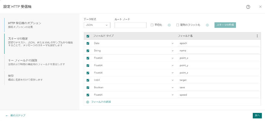 スキーマの指定では、X (経度)および Y (緯度)、対象となるデータの ID と日時を含めるようにします。