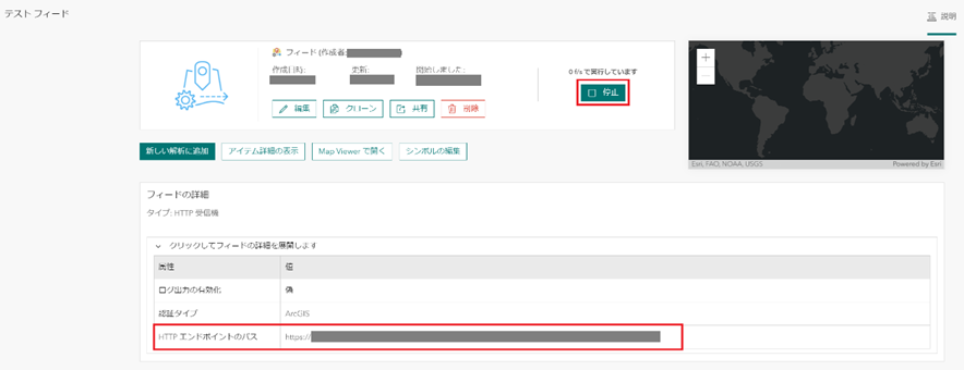 フィードで受信したデータの確認は、ArcGIS Velocity のフィードの詳細画面、もしくは、「Map Viewer で開く」から Map Viewer 上での確認ができます。