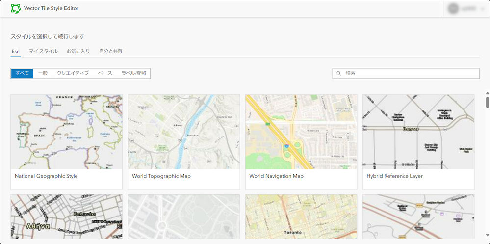 [+新規スタイル] ボタンをクリックすると作成が開始されます。Vector Tile Style Editor では Esri の提供する合計 70 種類以上ものベースマップからカスタマイズを始めることができます。カスタマイズを始めたいベースマップをクリックして始めましょう。