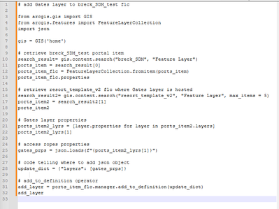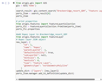 Hello, I am trying to add a new feature layer to an existing feature layer collection on AGO via the add_to_definition operation using arcgis api for python (adding Ropes feature layer to Breckenridge_resort_SDM feature layer collection). I'm having trouble finding good code examples for adding a feature layer in this way using a JSON object (formatting). Here is my code as well as the error I'm getting. The layer I am trying to add to the feature layer collection is a layer within another hosted feature layer collection on AGO. I got the JSON object from copy and pasting the layer information from querying the properties of the feature layer collection. I would be so grateful to get some help on where I'm going wrong. Thanks