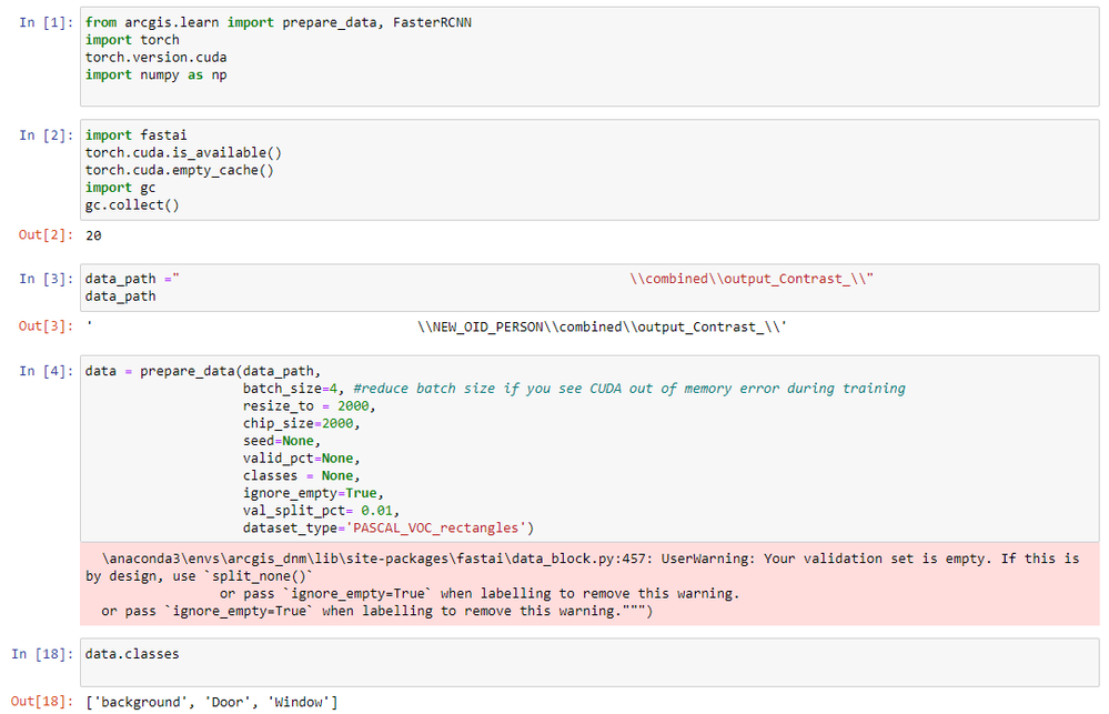 I'm trying to retrain Arcgis's Door and Window model with the ArcGIS Python API, but I'm getting an error. I am new to the field of deep learning. I will share the full code and error below. I tried a lot but I couldn't find how to fix the error. Thank you.
