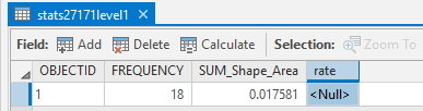 I need to calculate the field "rate" based on "SUM_Shape_Area" with the sum of "Shape_Area" in the second screenshot. So, the formula is "rate = SUM_Shape_Area/sum of Shape_Area". And I want to calculate the sum of Shape_Area first and then export it as a variable, and then use "arcpy.CalculateField_management" to calculate the "rate" field I need. I looked at different methods about how to calculate the sum of the field, but they did not work in my case. Could anyone help me with this? Any kind of help would be appreciated.