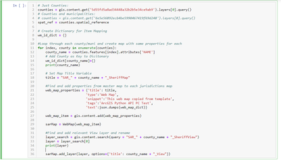 I'm definitely open to other options, but the tricky part is the item_mapping, because I want obviously the web map to be pointing at the one for the correct county, but also I have a host of other widgets interacting with the layers that I want to be mapped to the view layer in the map instead of the original layer. My thought is I'll probably have to go into the JSON dictionary and replace some IDs with variables, but given my lack of experience with those I was hoping to use a more out-of-the-box solution (cloning).