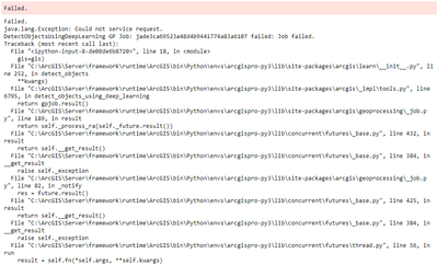 I am trying to run arcgis.learn.detect_object() function on an Image Server (ArcGIS Server 10.8.1) with 2 VM (2 GPUs Nvidia Tesla T4, 16GB RAM each one). I use the “Building Footprint Extraction – USA” as model and an image (5KmX2km, 0.1m ps) to test the site.