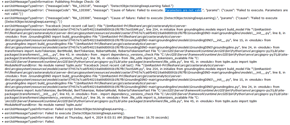 Note: The road extraction model successfully ran once with the same parameters. But after updating the server to support the TextSAM model, I still got the "Parameters are not valid" error, but the parameters were same as previous.