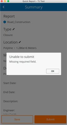 This might be a bug in QuickReport, expected behavior is when the required field is left blank, the submit button should be disabled.