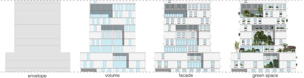 The volume rules are subtractive operations on the mass of the envelope that refine the outer shape of the building and determine the position of walls, doors, windows, slabs, green space etc.