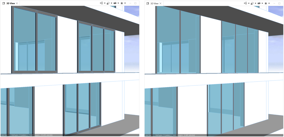 Now by selecting the building and changing the level_of_detail parameter on the envelope.cga we see a substantial difference in the polygon count, in this example approximately 15.000 versus 3.000 polygons.