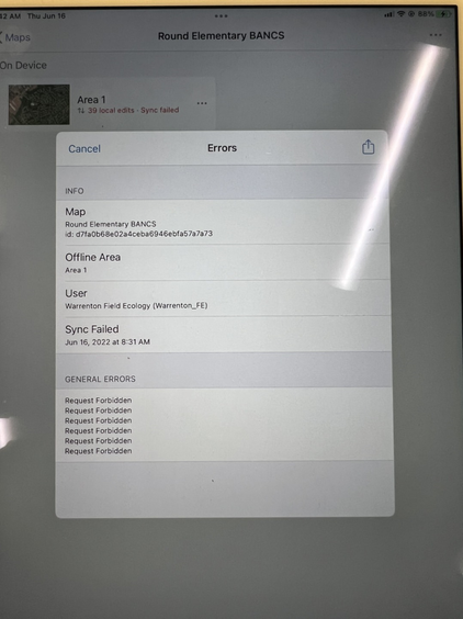 See screenshot below for the error message received. This user has not had issues syncing before, and I was able to create test points and sync successfully with that login info on that device in a different map. I also tested by creating a test point on two different devices, using the same login information, and then syncing. I thought maybe it was an issue with duplicate/conflicting object ID's, but it looks like the data simply gets corrected and whichever device is synced first gets priority for the object ID, and subsequent syncs automatically reassign a unique ID based on what's already in the dataset.
