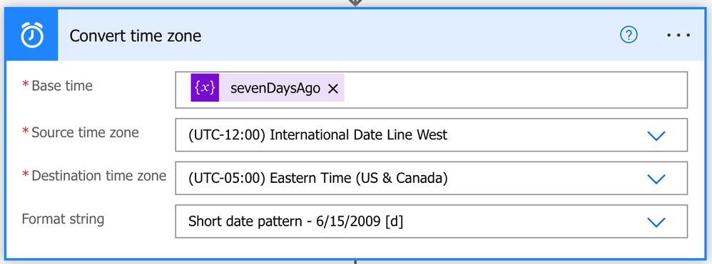 If you are looking to query for a time in a local time zone, the Convert Time Zone action will give the flexibility to convert to any time zone. In the screenshot below, I am converting the 'sevenDaysAgo' variable from UTC to Eastern Time.