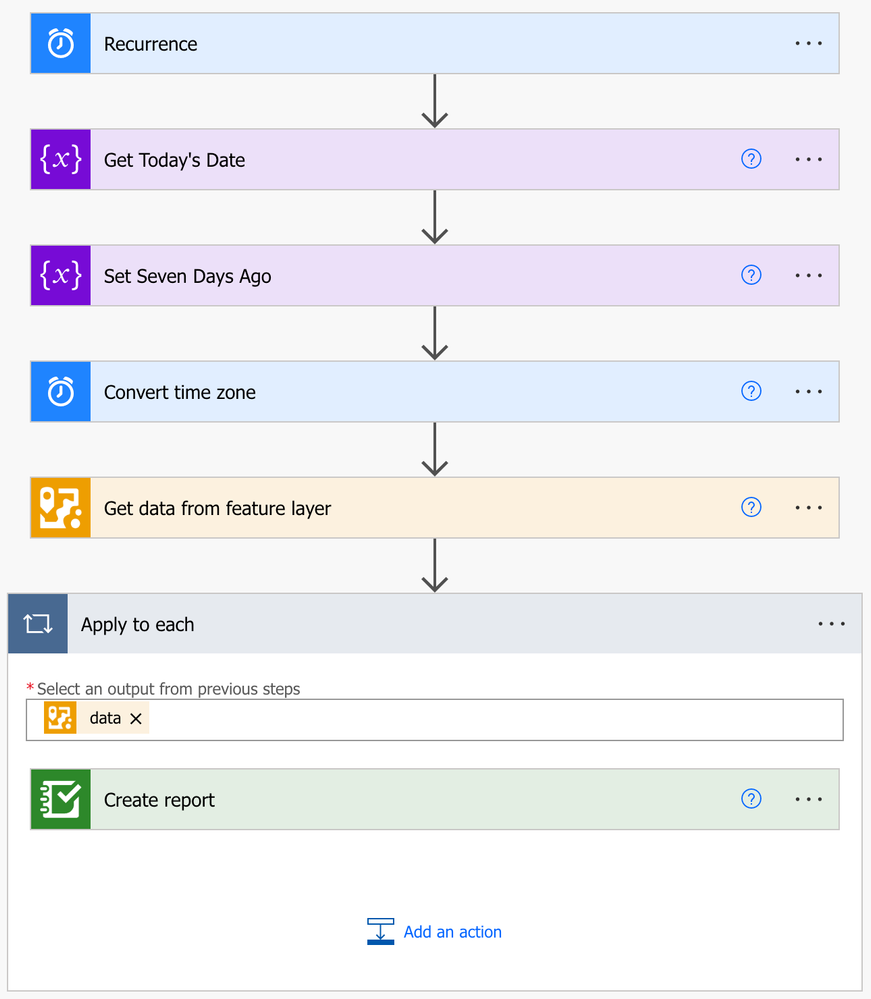 Now that we have the start date, we can get all of the records that have been created during the desired time range. The 'Get data from feature layer' action will query the feature layer for us filtered by the desired date range.