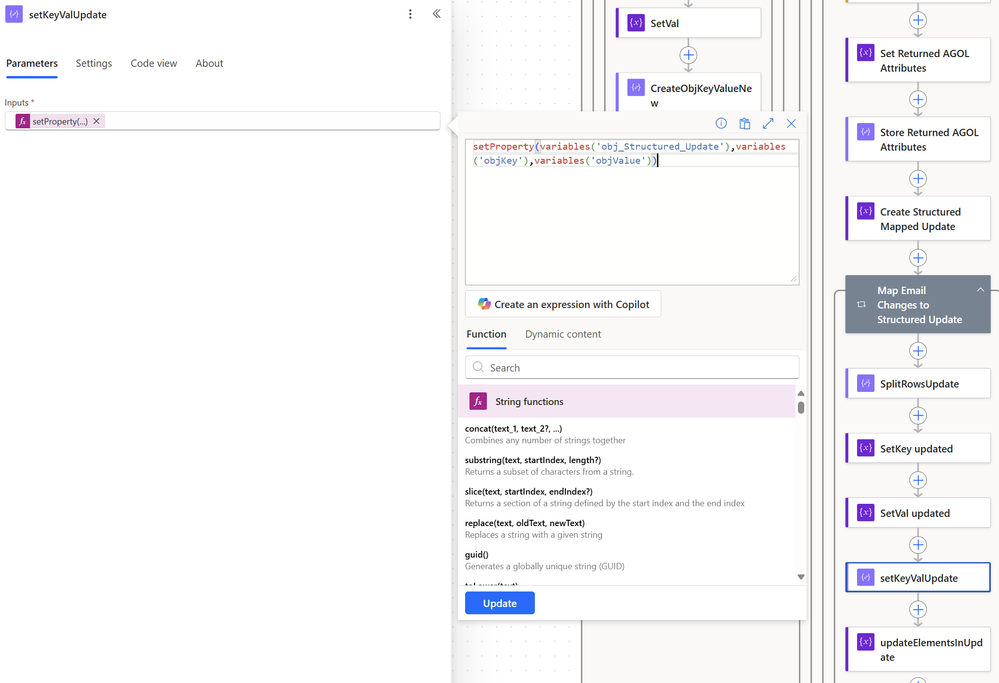 Apply to Each: For each of my parsed records i set key and value to a variable. Whichever key/value pairs I receive, update the object. It'll just ignore any AGOL values i haven't parsed.