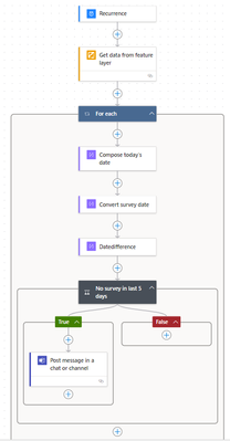 The idea is to just get the layer's data, and compare the last survey's date with today's date to see if more than 5 days have passed since the last survey submission.