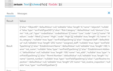 }But, like the Schema function, this only helps us with the attributes that already existed in incoming FeatureSet, not our new fields. There's no Splice for dictionaries, but since we can create new values simply by calling dictionary['new_key'] = new_value, it's pretty simple: