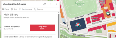 My dataset of libraries has two attributes: capacity (integer) and current occupancy (integer). In the web map, I have configured the libraries to be displayed with a colour based on how busy the library currently is (this is calculated by working out the current percentage occupancy ((currentoccupancy/capacity) * 100) and then classifying the value in to 'quiet', 'busy', 'very busy', 'full', and 'no data'):