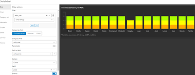 I used a sublayer from a hosted view in WMX to access extended properties fields. Our serial chart considered just distinct values when setting that parameter in the dashboard.