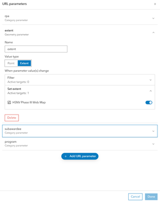 I'm working on a dashboard in ArcGIS Online and need to add a parameter to the end of the URL to the dashboard allowing filtering options and changing of the map extent for multiple maps within the dashboard.