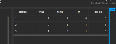 I built the main table which contains a column for each weather variable and then assigned TRUE or FALSE for each variable at each station.