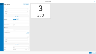 You can do this by using the Indicator widget and when configuring the widget, you can select the field from birdcount and set filter to include values with 'Y' so it will provide you the count of the records. and for the reference value you can then set as statistic and select Sum for the workhours and additionally you may set the same filter to sum only the records with 'Y'.