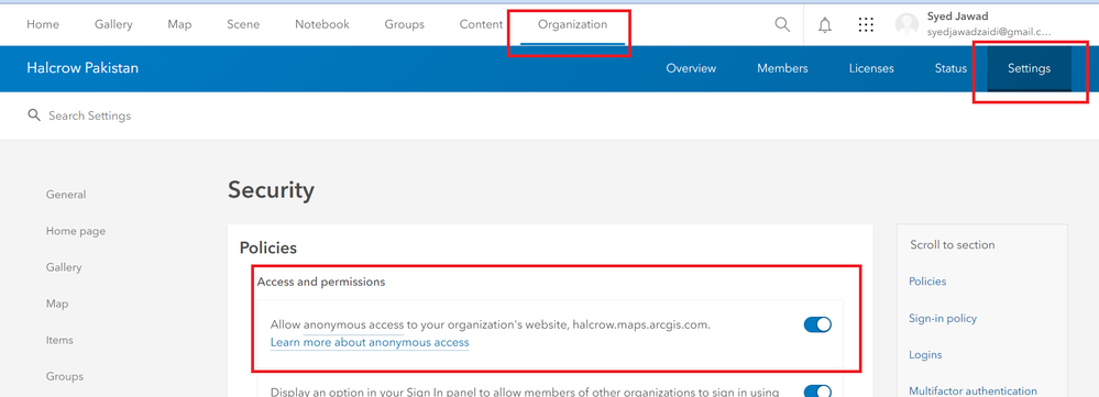 First you need to enable the permissions to allow everyone to access your shared content outside your organization for that you need to first go to the home page of your organization…then go to the settings…..in settings tab go to the security on left side of the page…..within the security tab go to the policies and enable “Allow anonymous user option ’…shown in the picture…..then go to the sharing and share the dashboard again using short url and you will be good to go