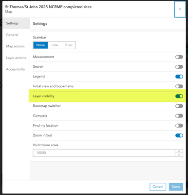 The map's Settings dialog includes a toggle for Layer visibility