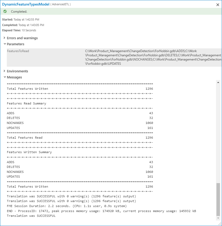 That's it! The DynamicFeatureTypes model can be run like a normal project geoprocessing tool with the ability to select any desired inputs, and the Spatial ETL tool behind the scenes takes what it gets. If you select inputs from different File Geodatabases the precondition check will prevent the tool from executing.