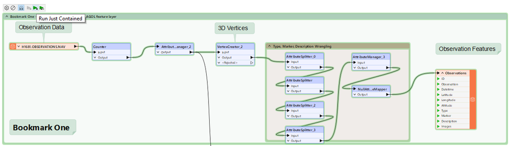 Bookmark One creates the Observations feature service and write its features. You run a bookmark by clicking and hovering on the top of the bookmark until small icons appear on the top. Click on the Run Just Contained play button.