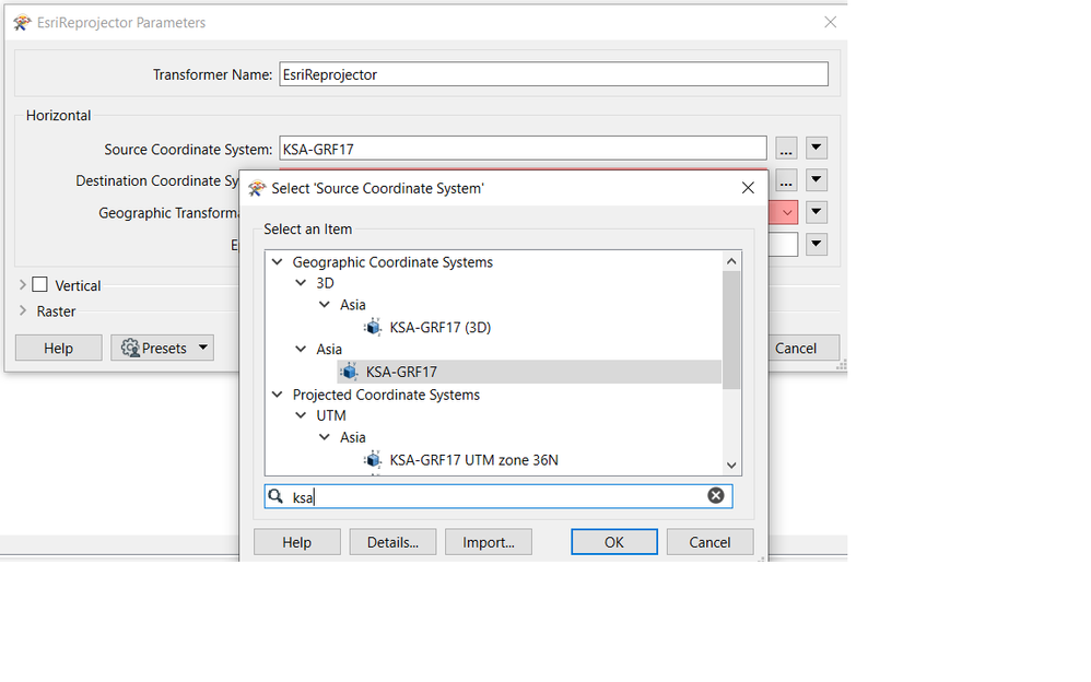 While using the 'Coordinate System Setter' transformer, I am unable to find the Coordinate system for KSA-GRF17 WKID: 9333 Authority: EPSG. However, It is available in ArcGIS Pro and ArcMap.