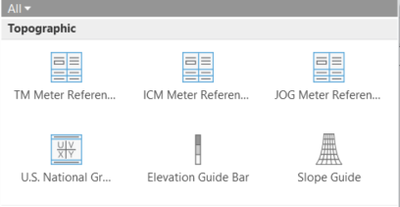 ArcGIS Defense Mapping has implemented the standard elements that are in the MTM and TM map specifications which are available in the predefined layouts for the MTM and TM specifications that are in the Defense Mapping product files. You can also insert these elements from the Insert ribbon in ArcGIS Pro under the Map Surrounds section.
