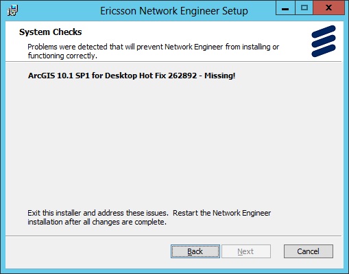 I am trying to install ENE (Ericsson Network Engineer) version 7. I have installad ArcGIS 10.1 with SP1 and Oracle 11g R2. When I try to install Network Engineer, It pops up with the error "ArcGIS 10.1 SP1 for Desktop Hot Fix 262892 - Missing!"