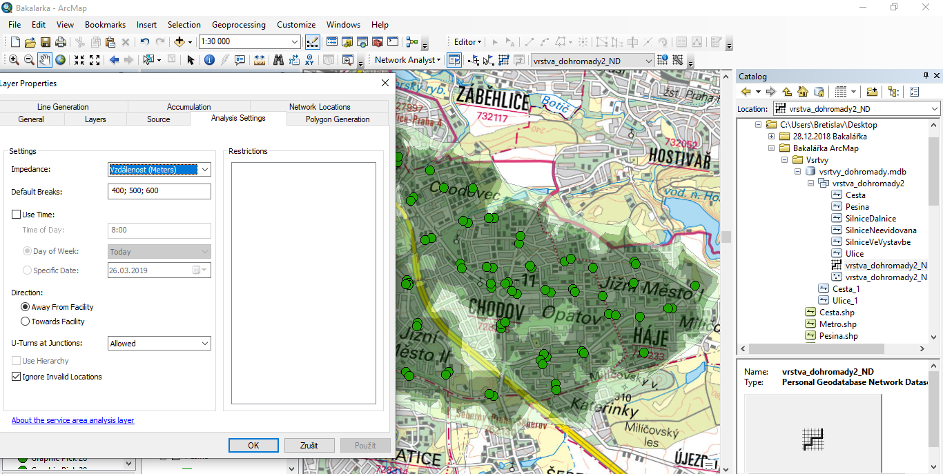 I create map of avaibality local bus stops. I have maps and geodatabase (street, pievements) and i make Network Analyst. Normal meters distance create the right map (screen "a"), but i have a problem with time distance. In Atribute table i recalculate shape length to walking time ["cas"] (screen "b") and take a value to the layer (screen "c"). If I give values 5;10;15 minutes program create this map (screen "d") and this is not right for me. I need something like in screen "a".