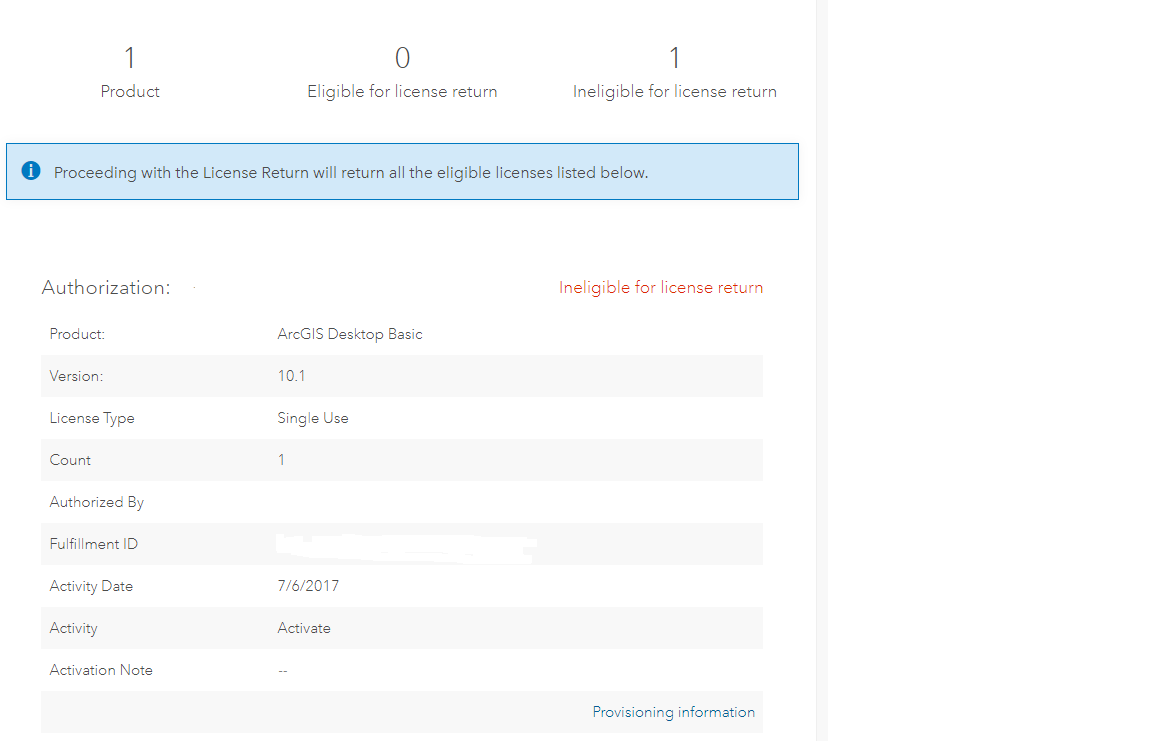 I'm trying to recover a license to a system no longer available. I have the Authorization number and the provisioning information. But when I try to recover the license a message is displayed Ineligible for license return. Any suggestions on how I can recover this license? Or an explanation on why the license cannot be recovered.