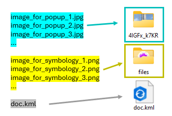 A KMZ file contains images that are displayed in the popup (JPG or JFIF) and images (PNG) that are used for symbology. The images are not regrouped in folders. The images used for the popups are displayed using CDATA in the <description> tag of the placemarks. Everything displays correctly in ArcGIS Earth.