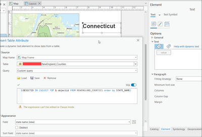Here is a screenshot of a dynamic text element that shows state-name from the first row. Pls note in my layer, I only had data from 3 different states from the New England region.