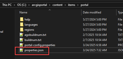 On our Portal server under C:\arcgisportal\content there is no 'properties.json' file. There is only a folder called 'items' and a file called 'site-key.json'