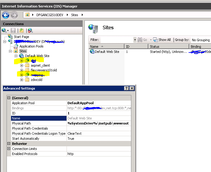• For examples, on  on my 10.4.x test machine (internal only, two web adaptrors (one set for public, other set for secure....these are separated to help me keep things organized when setting up the proxy)  My setup looks somethings like this (not accessible from outside our network, on purpose) notice, that is only has a Default Web Site, and although the Bindings show port 80 and any available IPs (*), none of the IPs on this machine have port 80 or 443 open.  I have two web adaptors installed on this machine (one for 80 and one for 443) which I have highlighted (and names blanked out) on the first image.