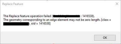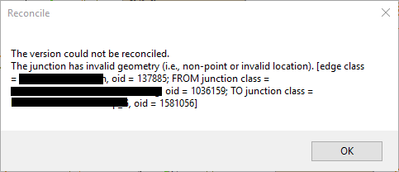 When I go to reconcile a session before posting, it will sometimes fail due to geometry errors when reconciling in favor of the child version or when trying to accept a pre-reconcile feature vs the conflict feature in the parent version. I copied screenshots of the errors below (sorry about blacking out the feature names, they have our company's name in it and I'd rather keep that anonymous.) I'm able to navigate to the feature and fix the problem, but sometimes there are numerous geometry errors and it is time consuming to fix an error, run the reconcile, fix another error, etc.