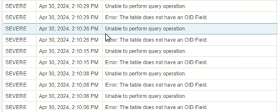 We also observed that when trying to click on features in new map viewer, server is generating SEVERE logs stating "Table does not have an OID", which is not true and we have an OID field.